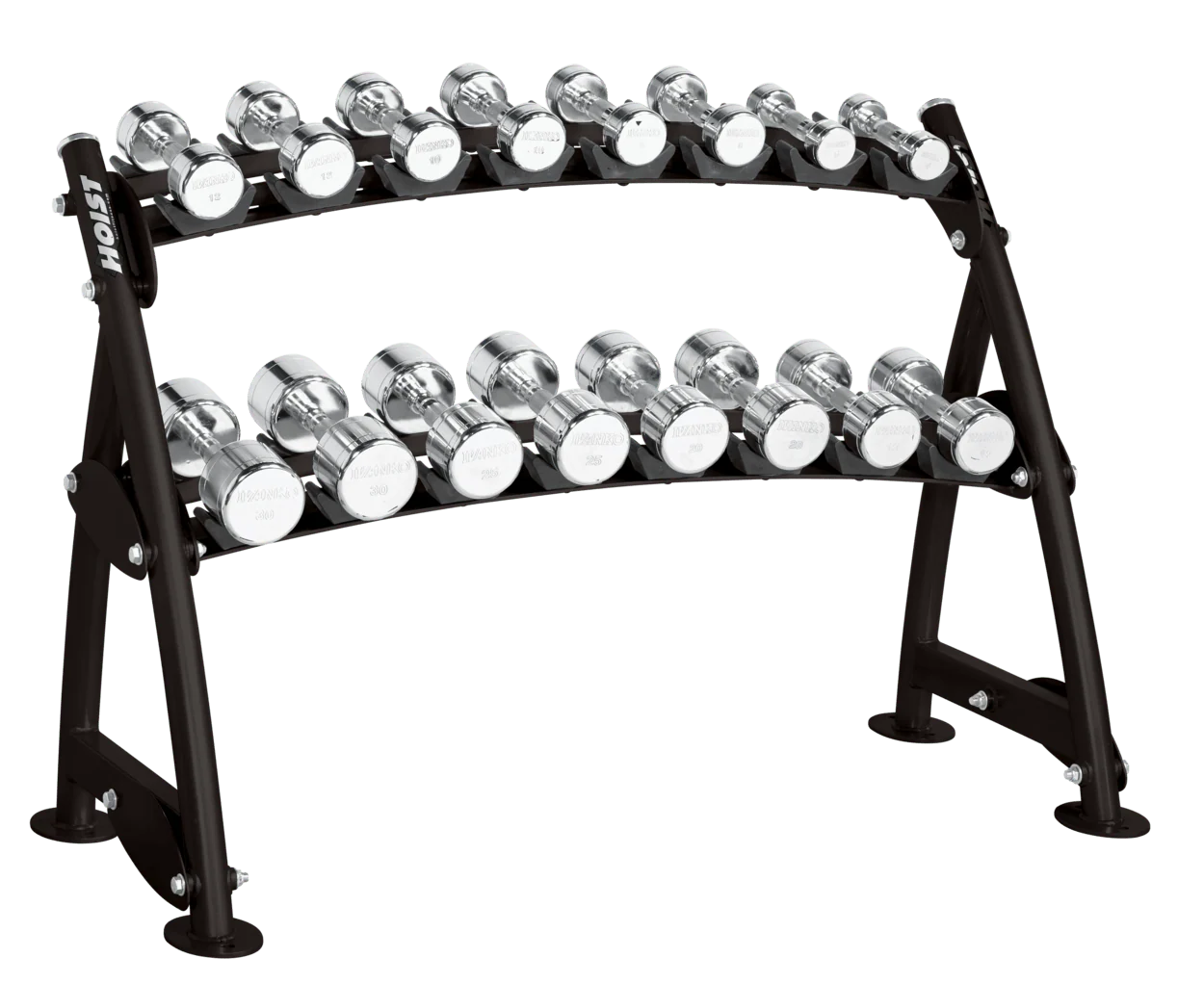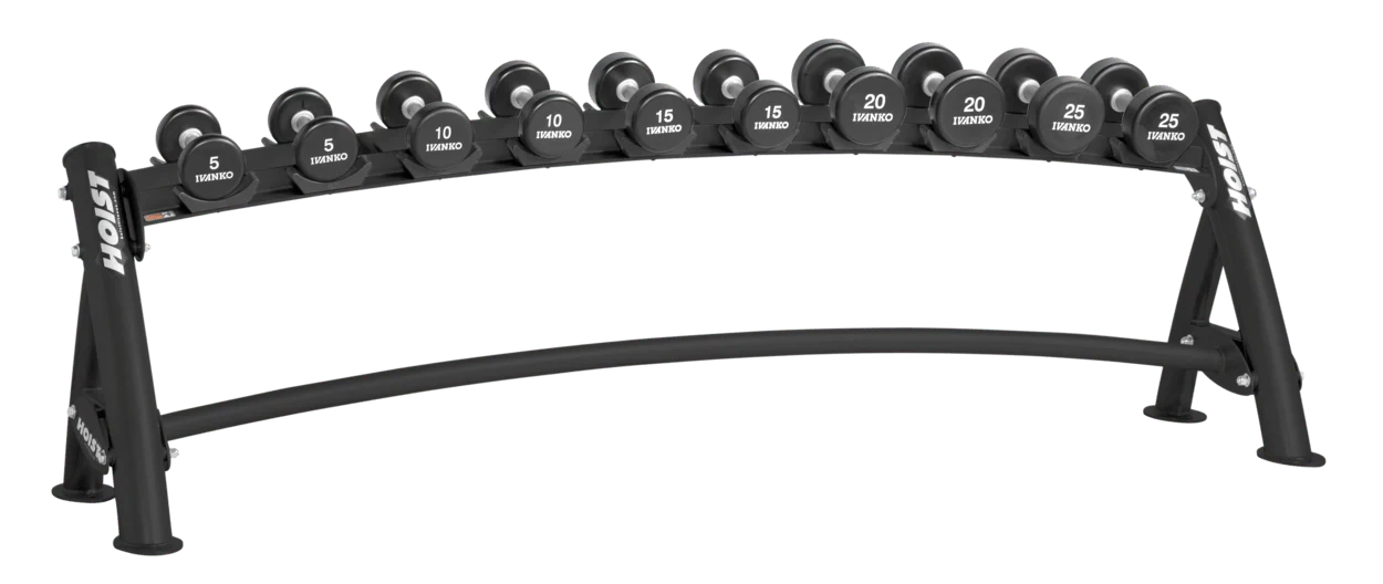 The HOIST 1-Tier Horizontal Dumbbell Rack CF-3461-1 is a sleek, space-efficient storage solution designed to organize and display dumbbells in commercial fitness environments.