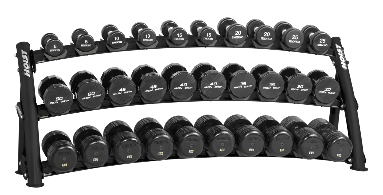 The HOIST 3-Tier Horizontal Dumbbell Rack CF-3461-3 is a high-capacity, commercial-grade storage solution designed to organize and display a full range of dumbbells with efficiency and style.