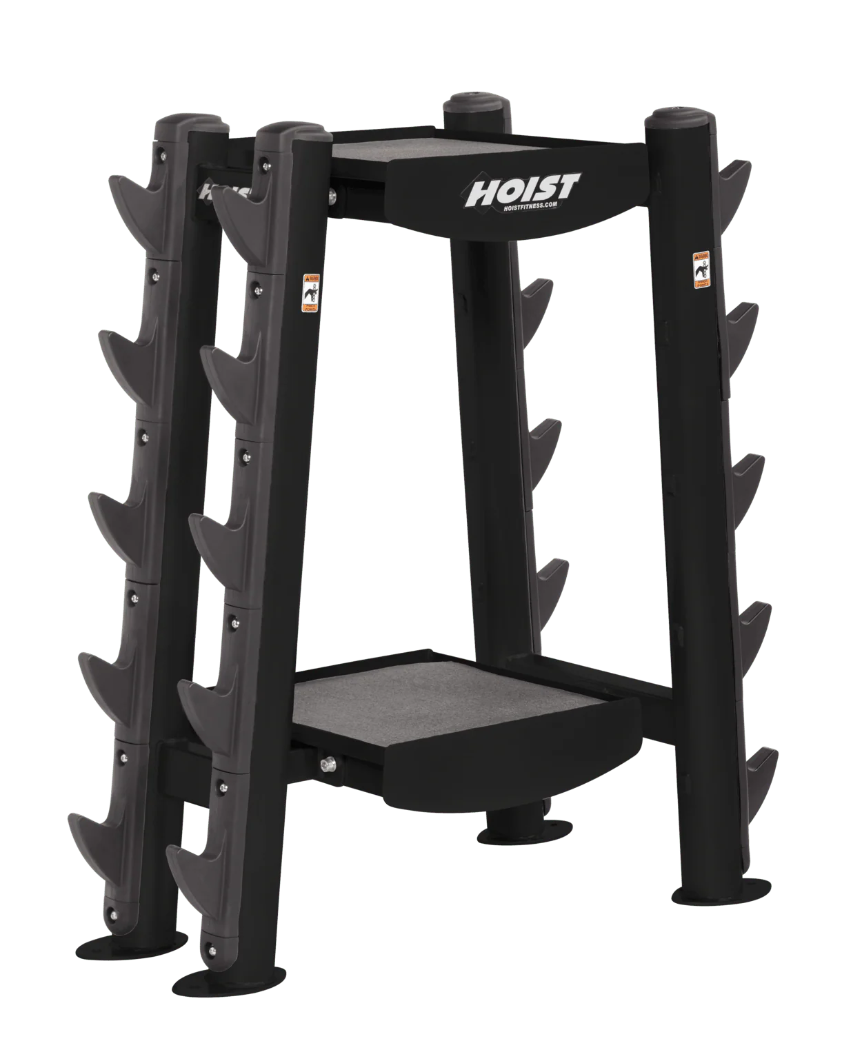 The HOIST 2-Tier Horizontal Beauty Bell Rack CF-3462-2 is a stylish and functional storage solution designed specifically for organizing beauty bells in commercial fitness settings.