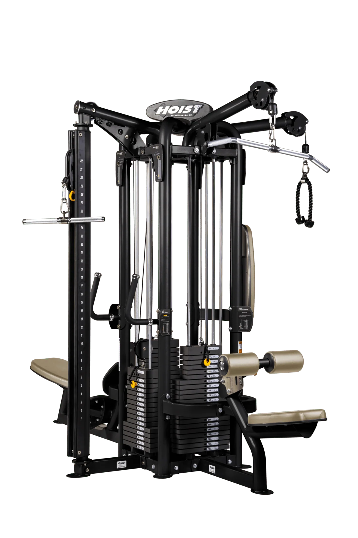 Part of Hoist’s Multi Jungle System, the CMD-6180 features dual 195 lb Silent Steel® weight stacks with a 2:1 resistance ratio, offering smooth and quiet operation. Its unique one-handed Hi-Lo Station adjusters allow users to quickly reposition pulleys across 32 height settings spaced at 2.5-inch increments, while rotating pulley columns provide a wide range of motion. The unit includes angled, neutral, rock climbing, and extra-wide straight grip options for varied pull-up exercises, plus stabilizing hand grips for added control during cable movements. Accessories such as aluminum curl bars, padded ankle straps, and single D handles enhance exercise variety. Designed for modular expansion, the CMD-6180 can be integrated into larger jungle gym pods, making it ideal for facilities seeking customizable, space-efficient strength solutions