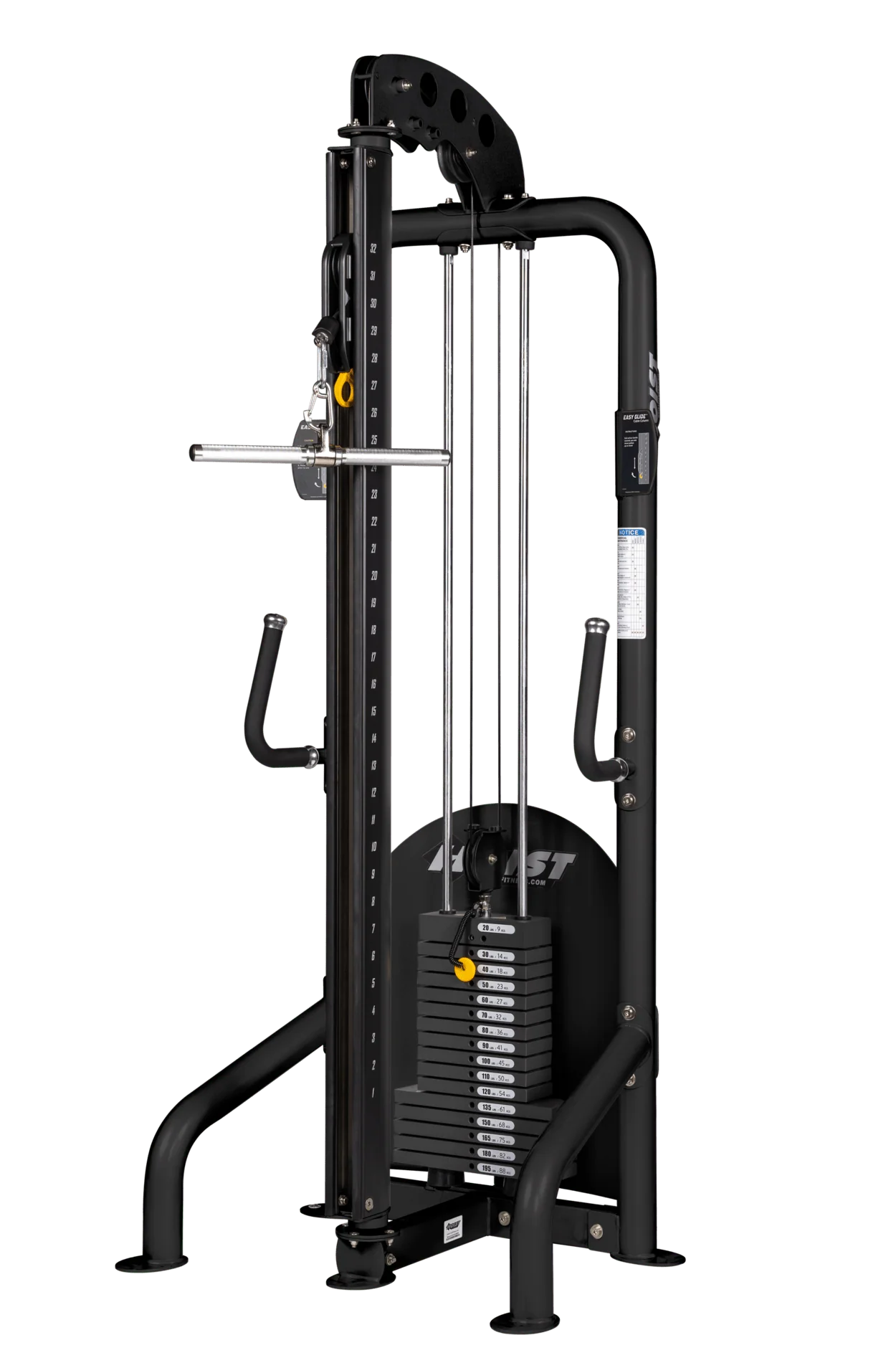 Part of Hoist’s Multi Jungle System, the CMS-6175-EZG features a unique one-handed Hi-Lo Station adjuster that allows users to quickly reposition the pulley across 32 height settings spaced at 2.5-inch increments. Its rotating pulley columns offer 360-degree movement, enabling a wide range of functional exercises. The unit includes stabilizing hand grips on both sides for added control, and comes equipped with strap handles and a padded ankle strap for exercise variety. Powered by a 195 lb Silent Steel® weight stack with a 2:1 resistance ratio, the CMS-6175-EZG delivers smooth, quiet operation and ergonomic precision, making it ideal for facilities seeking compact, high-performance cable training solutions.